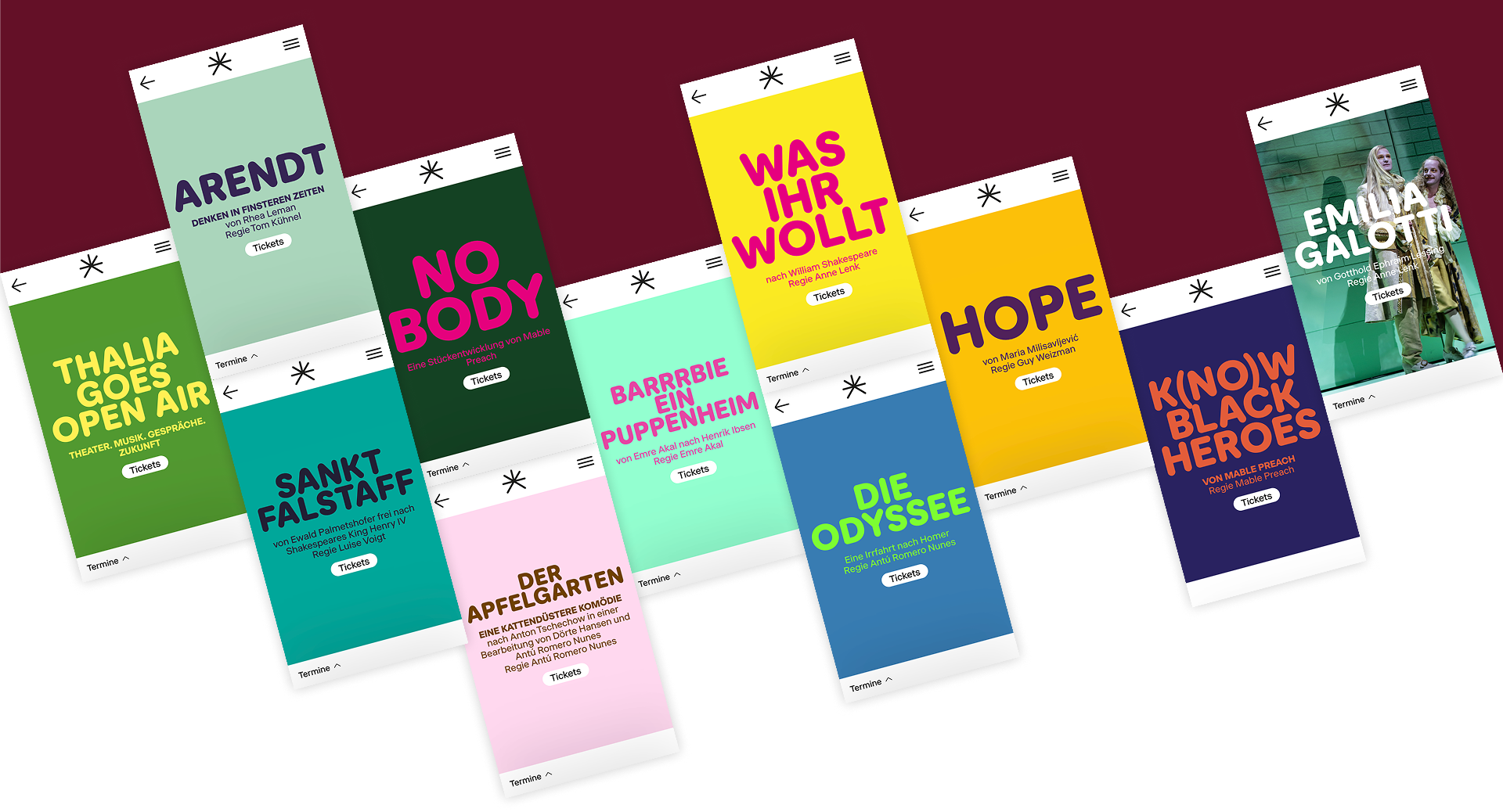 Die Idee war, die neue künstlerische Ausrichtung und das neue Corporate Design online erlebbar zu machen und gleichzeitig der komplexen Alltagsrealität eines Repertoiretheaters gerecht zu werden. Die Website sollte „alle Farben dieser Welt“ widerspiegeln, ohne dabei die Orientierung zu beeinträchtigen. Wir haben ein System entwickelt, das das Programmheft wie eine Dramaturgie entfalten lässt: von saisonalen Kampagnen bis zum Tagesprogramm, von der Entdeckung bis zur Entscheidung. Gleichermaßen wichtig: die Entlastung der Redaktion, damit das Team schnell auf aktuelle Diskurse und spontane Programmänderungen reagieren kann.