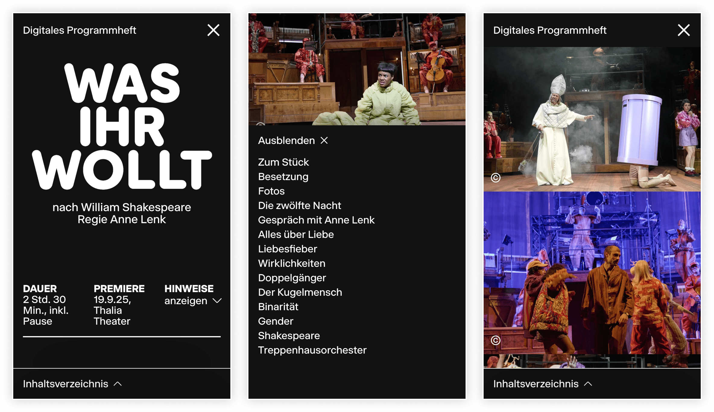 Im Kern steht ein robustes CMS für Produktionen, Kampagnen, Veranstaltungen und Abonnements. Redakteur:innem weisen Farblogiken zu und konfigurieren die Startseite mit Drag-and-Drop-Modulen. Eine kompakte „Heute & Morgen”-Seitenleiste zeigt die nächsten Vorstellungen für spontane Besuche an. Eine interaktive Abonnementmatrix macht komplexe Angebote wie Thalia-Karten oder Flex-Pässe transparent und vergleichbar. Der dunkle „Event-Modus” unterstützt digitale Programmhefte auf mobilen Geräten.