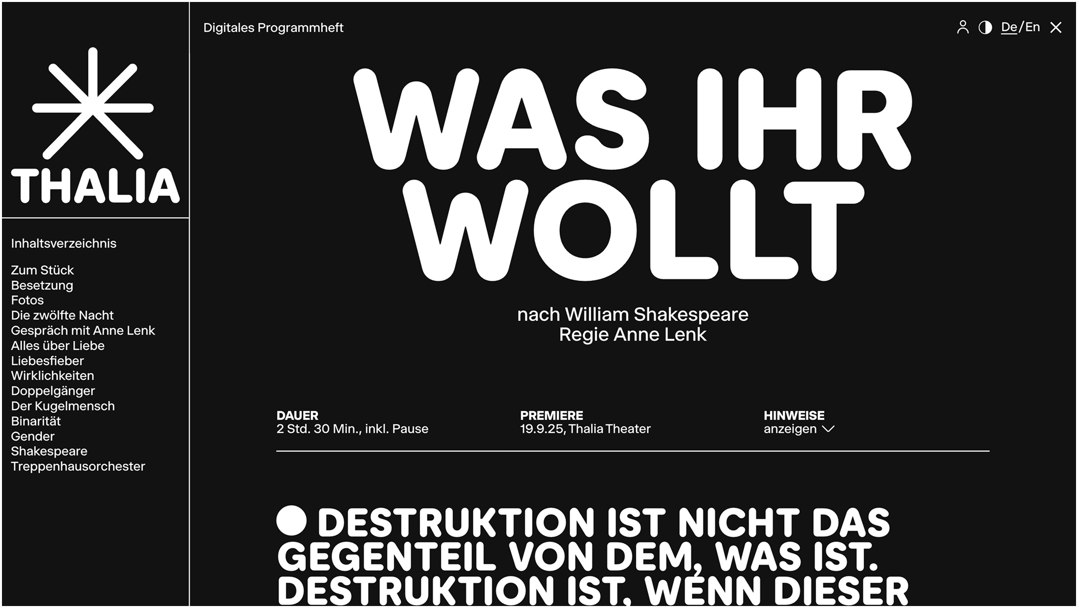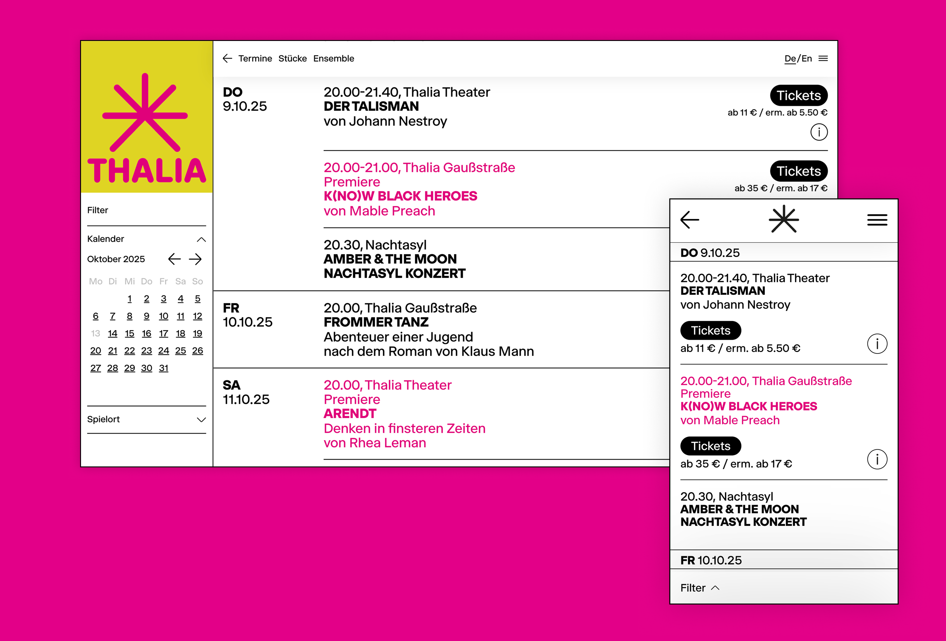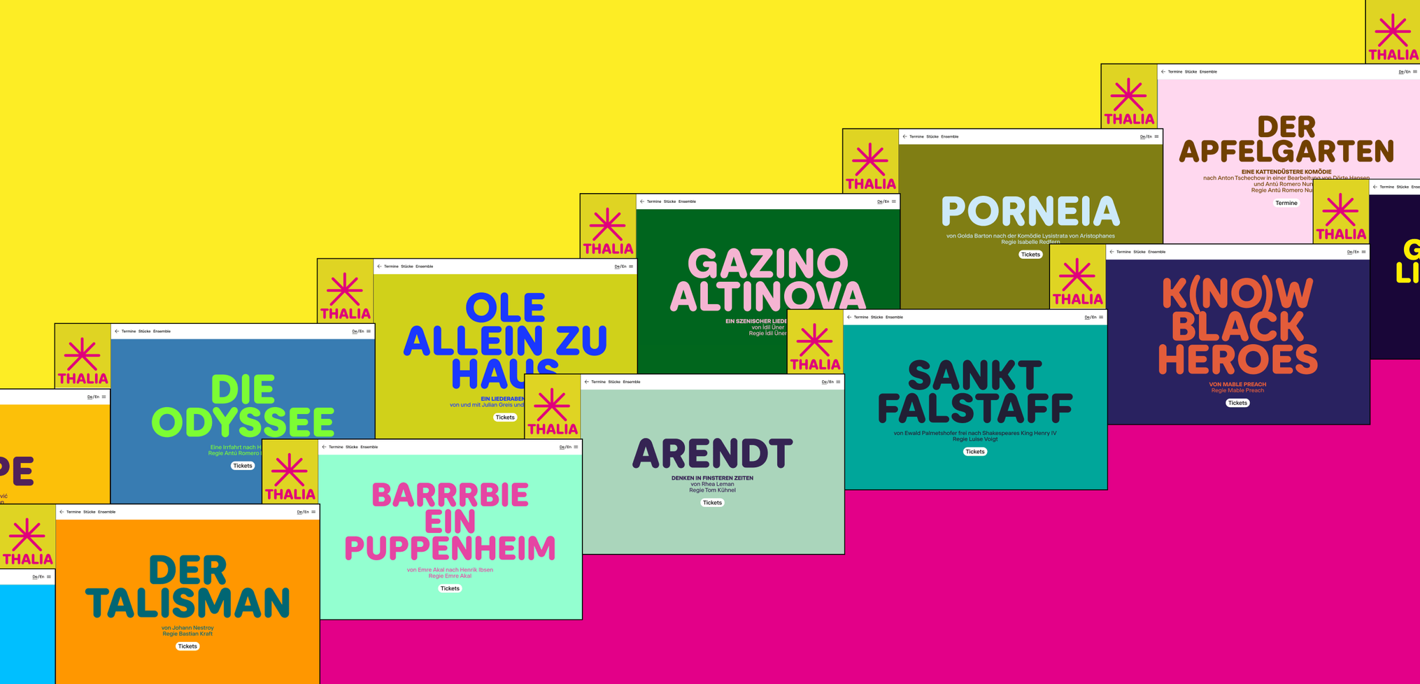 Was das Projekt auszeichnet, ist die konsequente Systematisierung einer ausdrucksstarken Identität. Anstelle von festen Layouts haben wir Regeln aufgestellt: Farben pro Produktion, responsive Typografie, modulare Dramaturgie. So kann sich das Thalia Theater bei Premieren, Festivals oder Stadtprojekten unterschiedlich inszenieren, ohne an Wiedererkennbarkeit zu verlieren. Die kreisförmige Bewegung verleiht der Website eine poetische, theatralische Qualität, während das Interaktionsdesign zurückhaltend bleibt. Komplexe Produkte wie Abonnements werden nicht in PDFs versteckt, sondern zu interaktiven Tools. Das Ergebnis ist sowohl redaktionell stark als auch publikumsfreundlich.