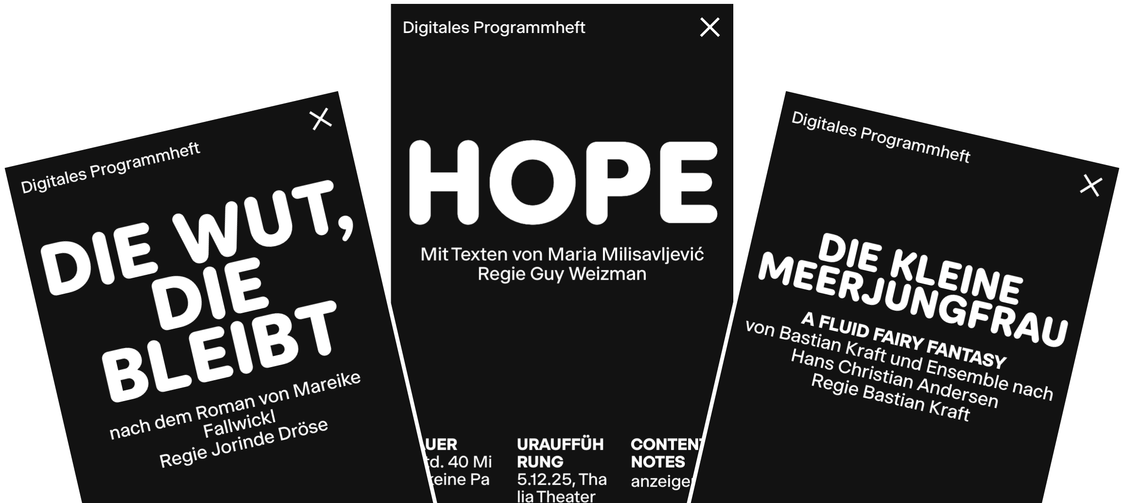 We developed a digital programme booklet for the Thalia Theater that is fully integrated into the new website. It combines interactive content with clear, mobile-friendly navigation and is largely generated automatically from existing data.
